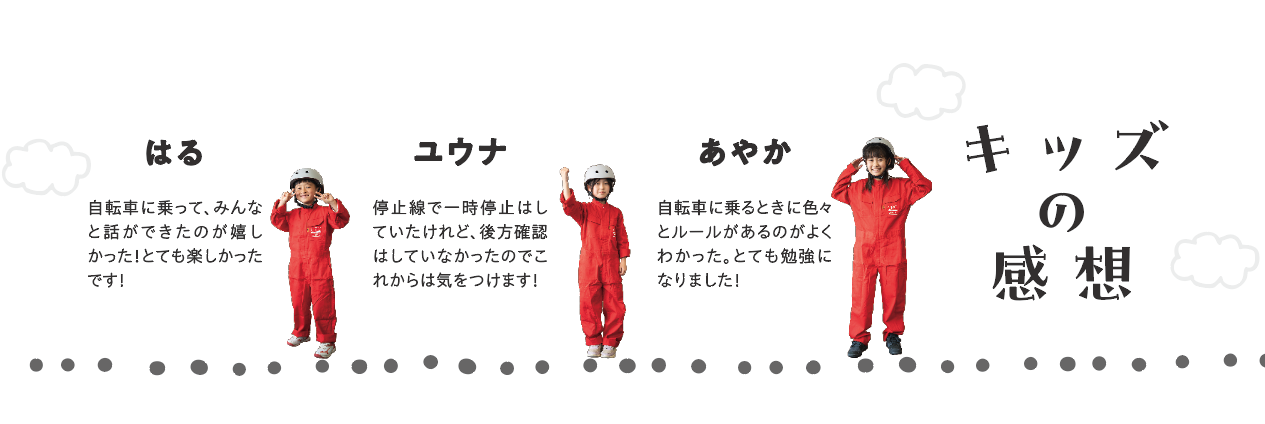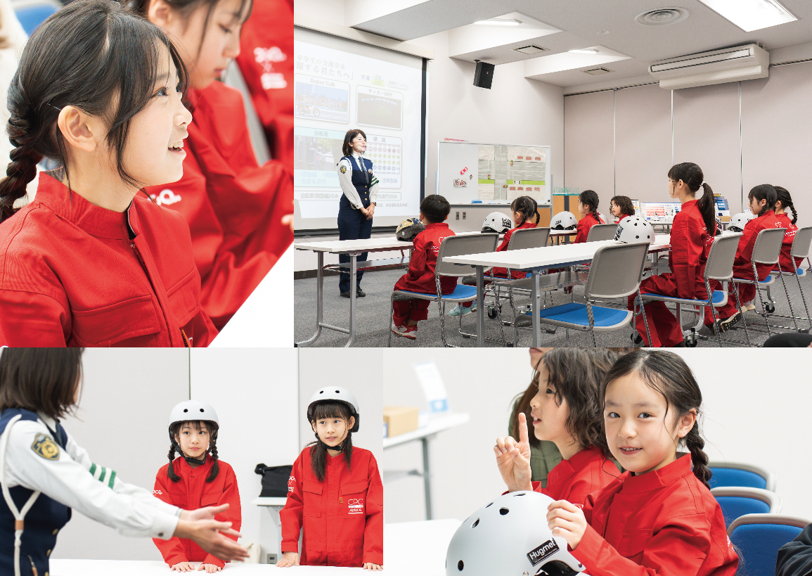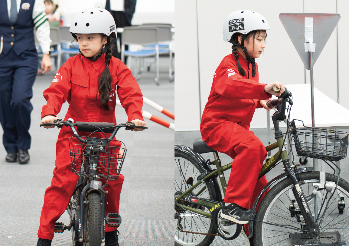 いつもの暮らしで当たり前のように乗っている自転車だけれど、正しい交通ルールや乗り方について、知っている、もしくは守れていると思いますか?とても大切なことだから、しっかり学ぶ機会があるといいですよね。 そこで今回は、春の全国交通安全運動の期間に合わせて、大阪府天満警察署の警察官に教えていただく「春の交通安全教室」を中央自動車工業さまの本社にて開催。自転車が大好きなキッズと保護者の皆さまにお集まりいただきました。 会場は、大阪・中之島にある中央自動車工業さまの本社ビル。広々とした会議室に到着したキッズたちは、中央自動車工業さまにご用意いただいた真っ赤なツナギに着替えて着席します。 まずは、DVDを見ながら交通ルールを学ぶ講座からスタート。小学生が自転車に乗る日常の映像から、交通ルールが守られていない箇所を見つける参加型の講座です。天満警察署の警察官、森脇さんと松本さんが親しみやすい口調でキッズたちに語りかけます。「今のシーンで交通ルールを守れていなかったところはどこかな?」と質問すると、キッズたちは次々に手をあげて「止まって確認しなかったから。」「並んで自転車に乗っていたところ。」などと発言。みんな積極的に参加していますね。 森脇さんのお話によると、自転車は道路交通法では「軽車両」に位置づけられていて、道路を通行するときは「車のなかま」としてルールを守り、安全運転をすることが義務づけられているそうです。 キッズたちは、おおむね交通ルールを知っていましたが、「信号機のある交差点では青になってから、または一時停止の表示のある交差点では必ず一時停止をして、左右や後方の安全を確認後横断する」というルールについては「意識していなかった、守っていなかった」と思う子が多かったようです。参加型の交通安全教室では、みんなが元気いっぱいに発言できて、ルールが再認識でき、とても良い学びになりましたね。