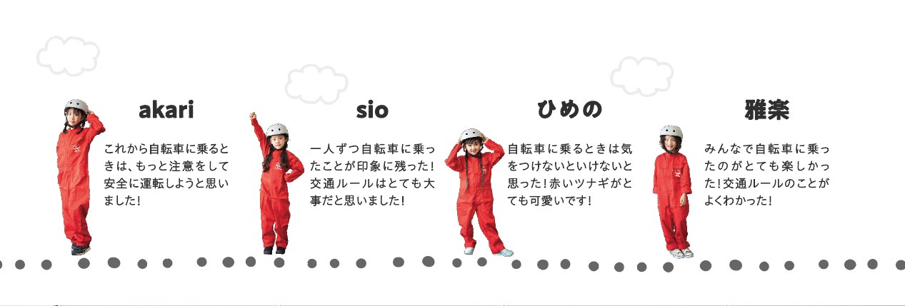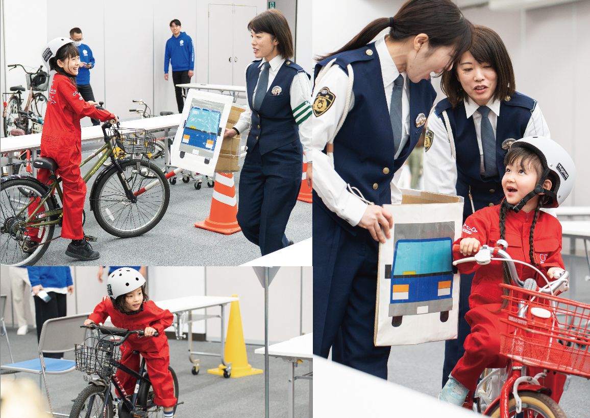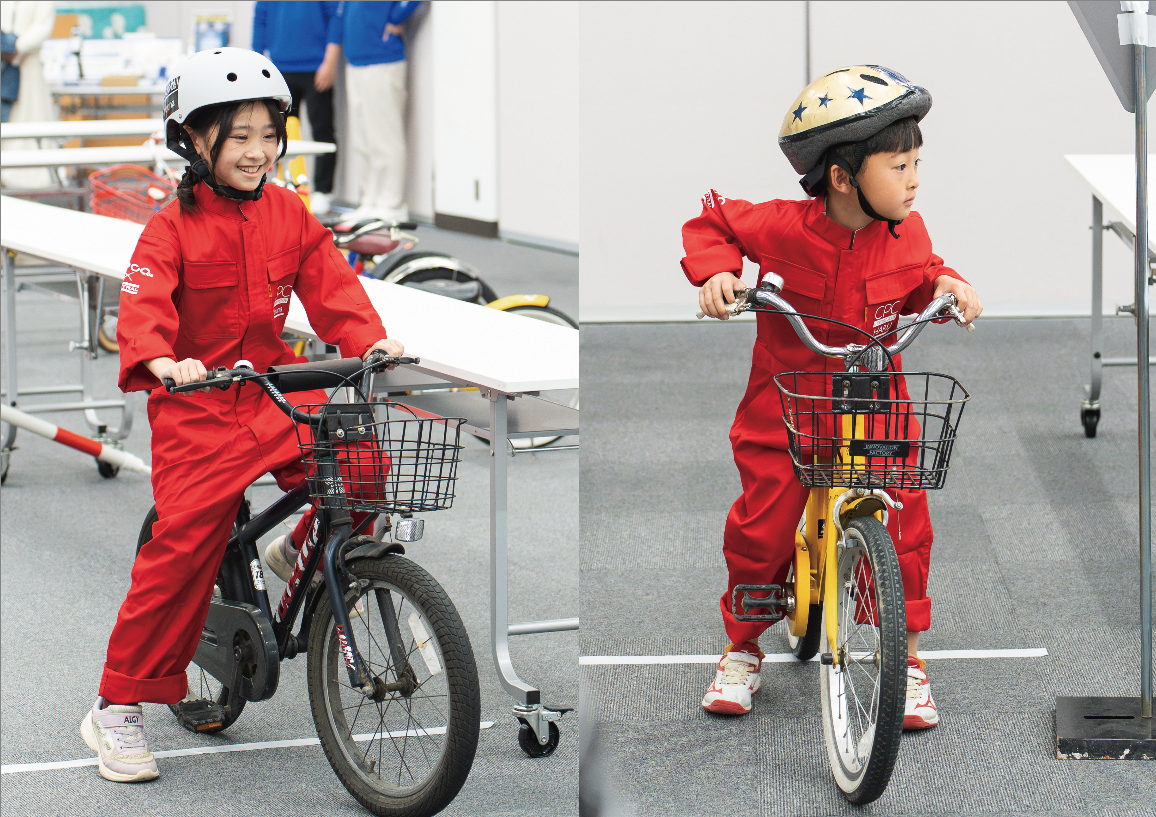 昨今では、小学生で一番多い事故は「歩行中」、次いで「自転車乗車中」という統計が出ており、事故全体の約3割を占めているそうです。気をつけなければいけませんね。 また改正道路交通法の施行により、令和5年4月1日から全ての自転車利用者のヘルメット着用が努力義務化されました。街なかではヘルメットをかぶらず自転車に乗っている子どもをよく見かけます。不慮の事故を防ぐためにも、ヘルメット着用ルールは必ず守りたいものです。 今回、中央自動車工業さまから参加したキッズたちにニックネーム入りのヘルメットが進呈され、みんな大喜びでした。 参加型の講座で学び、実際に自転車に乗って体験する今回の企画では、楽しくルールを学べたことがとても有意義だったようです。次に、「正しい自転車の乗り方教室」を実施しました。机とカラーコーンを使って道路を作り、ミニ信号機や標識を設置して公道に見立てます。はじめに警察官の松本さんに、見本となる自転車の安全運転をしていただき、その後一人ずつ自分の身長に合った自転車に乗って安全運転を行う体験教室です。 先ほど講座で学んだ「左側通行」や、「青信号、または一時停止ラインに来たら必ず止まって左右・後方の安全を確認する」というルールを実践する場になります。 キッズたちはとてもリラックスした様子で自転車に乗り、信号やトラックが来たときの一時停止、安全確認などもしっかり出来ていて、警察官の方たちも感心しておられました。自転車が好きなキッズたちが集まったので、みんな笑顔で自転車に乗っていたのが印象的でした。