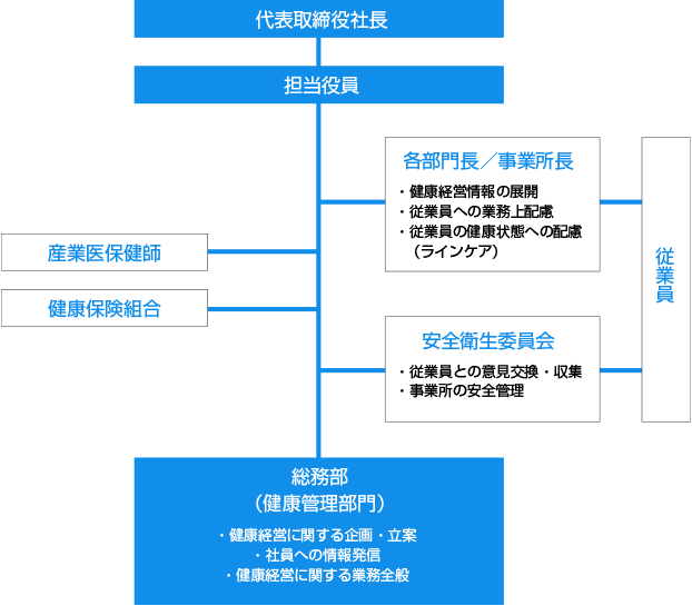 健康経営を推進するために、代表取締役社長が責任者となり、健康経営を牽引するとともに、執行責任者である取締役と総務部が中心となり、健康保険組合や産業医と連携し従業員の健康づくりを推進していきます。